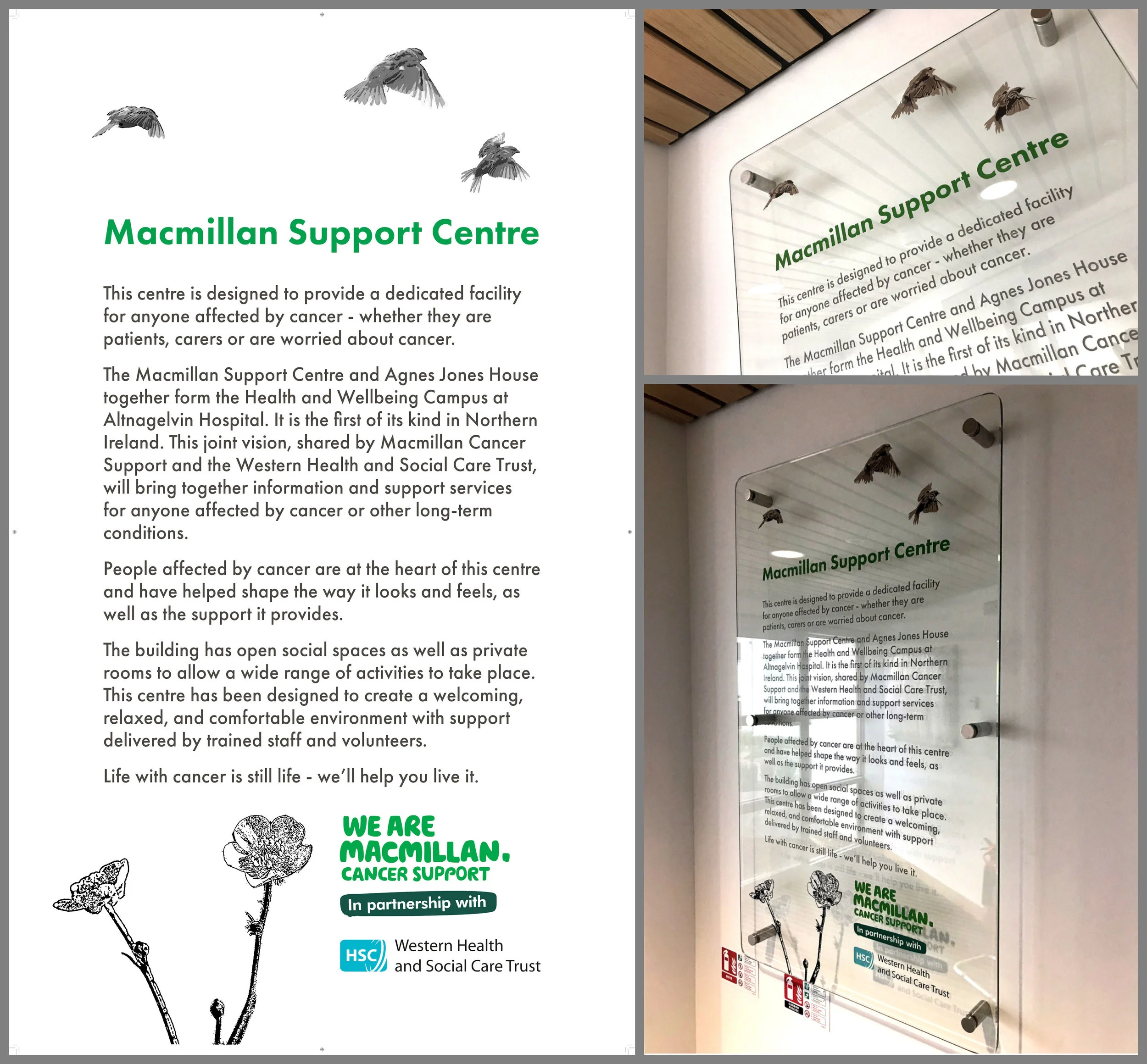 In collaboration with local artist Locky Morris, Alpha were commissioned to create a decorative glass piece at the entrance of the new Macmillan Cancer Support Centre, Altnagelvin Hospital, Derry.